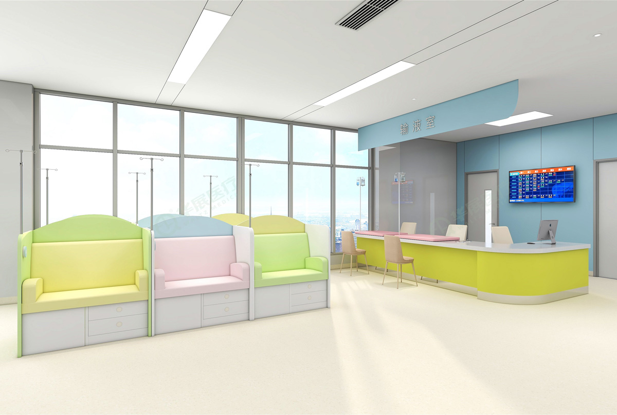 输液室主要承担各类注射工作,如静脉输液、静脉注射、肌肉注射等。输液室设有输液接待处、治疗室、输液区等。并且输液室是医院重要的服务窗口,患者多、流动性大、病种多、输液药品繁杂。此外,患者在输液过程中由于等候时间较长,加上身体的不适感,容易产生烦躁情绪,因此,输液室的环境和布局应尽可能整洁、舒适、温馨。